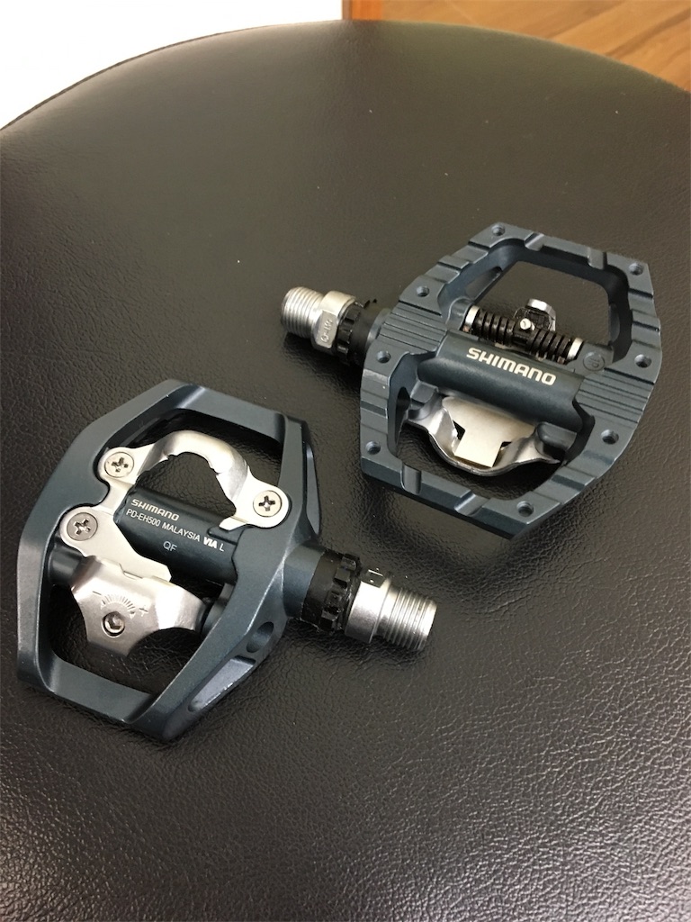 2018-07-21 新入荷!ロードツーリングペダル! 【商品紹介】スポーツ系用品 こんにちは東越谷店です。 本日はペダル新製品のこちらをご紹介いたします(^^) こちらは片面フラット反対側SPDの定番 シマノPD-A430の後継的モデル PD-EH500というモデルです。 前作との違いはフラット側の加工です。 こちらの凹みは 同梱されているこちらのピンを装置することで ソールの喰いつきが良くなります。 デイリーユースにも更によくなりました(^^) 見た目も全体的にメカニカルな趣きになりました。 もちろんSPDクリートも同梱されています。 ちなみに同梱クリートはマルチモードクリートです。 当店販売価格は8,330円(税込)となります。 もちろん取り付けも承っております(別途工賃) ご興味ある方是非!